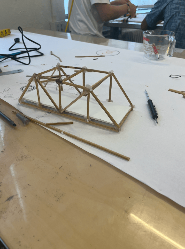 Throughout my lectures, I was also able to participate in hands-on activities. I have included three pictures from these activities above. The first picture on the left shows a bridge that I was able to build during the civil engineering unit. In this unit we learned about trusses and bridges. The second image depicts two soda bottles connected to a pressure regulator and air pump. This was part of the pneumatic power unit where we learned about the gas laws and pressure in relationship to volume and temperature. The last picture shows an Arduino board. I learned how to connect the Arduino board to its integrated development environment (IDE) and was able to run a program that controls an LED light system!
