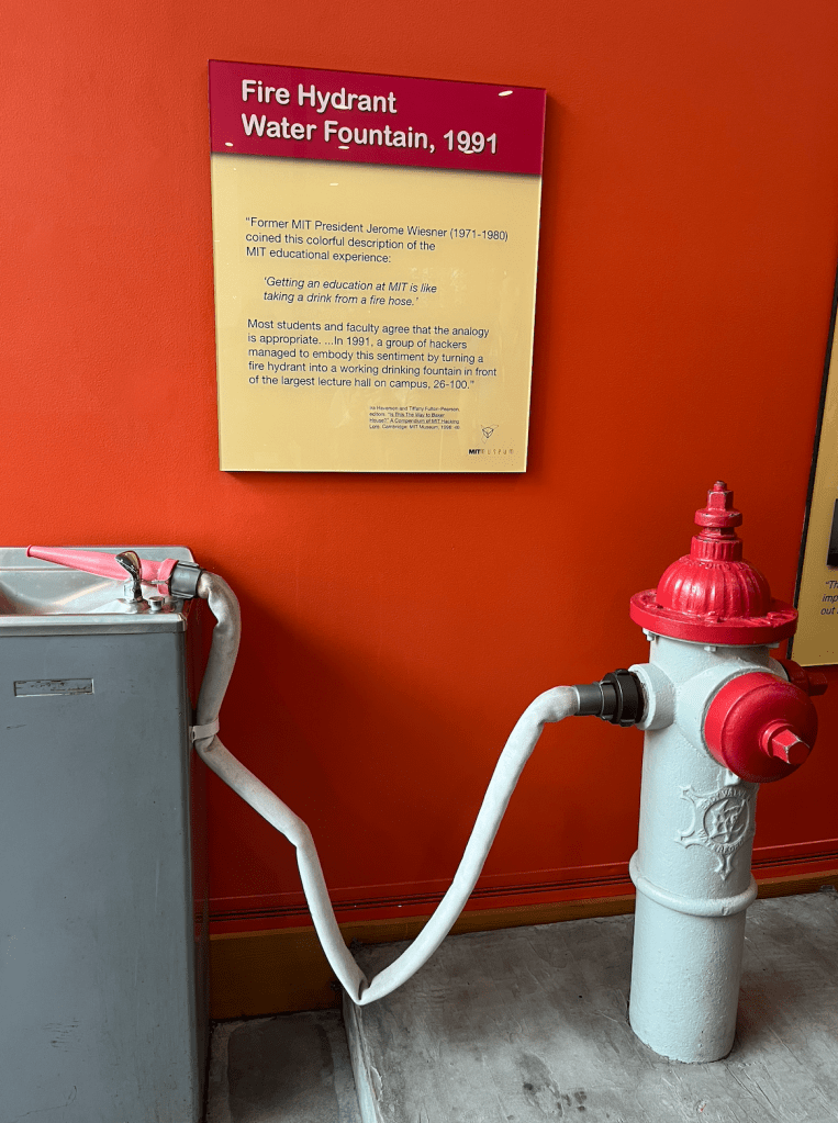 The last image on the right shows a fire hydrant connected to a water fountain which I saw while touring MIT’s campus. This water fountain embodies a quote by former MIT President Jerome Wiesner who stated that “getting an education at MIT is like taking a drink from a fire hose”!