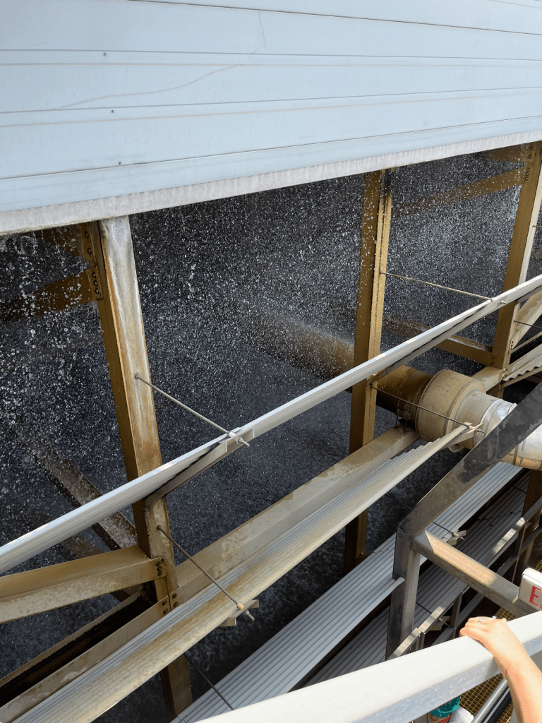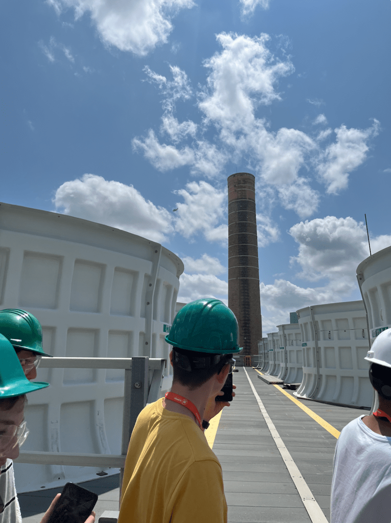 I also got the opportunity to tour MIT’s Cogeneration Plant, wind tunnel, and campus! The cogeneration plant uses natural gas to create both electrical and thermal energy. The process starts when a gas turbine and generator converts natural gas into electrical energy. This process creates hot exhaust gases which are then sent through a heat recovery unit to create thermal energy. Both heating (from steam and hot water) and cooling (through chillers powered by steam turbines) is accomplished for use on campus. The first two pictures show part of the plant’s water recovery system. The system works by electrically charging water vapor from the plant, which then collect on a mesh of wires and fall onto a collecting pan for reuse in the plant. By charging the water vapor, more particles are drawn toward the wire mesh, allowing for more water particles to be captured and reused.