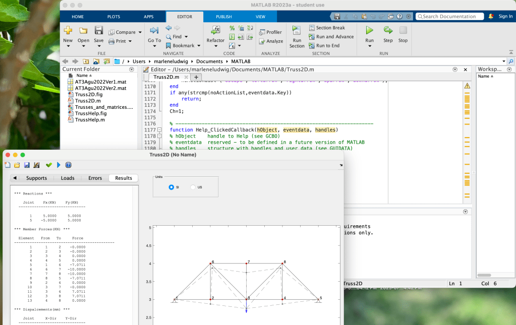 To prepare us for the camp, our professors requested that we complete the MATLAB Onramp course. This included the MATLAB programming environment, language, and data manipulations. This was very valuable as it allowed us to jump right into using MATLAB for various topics and engineering tasks throughout the course. The picture above shows an example were we used MATLAB to simulate the effect of forces on joints and trusses.